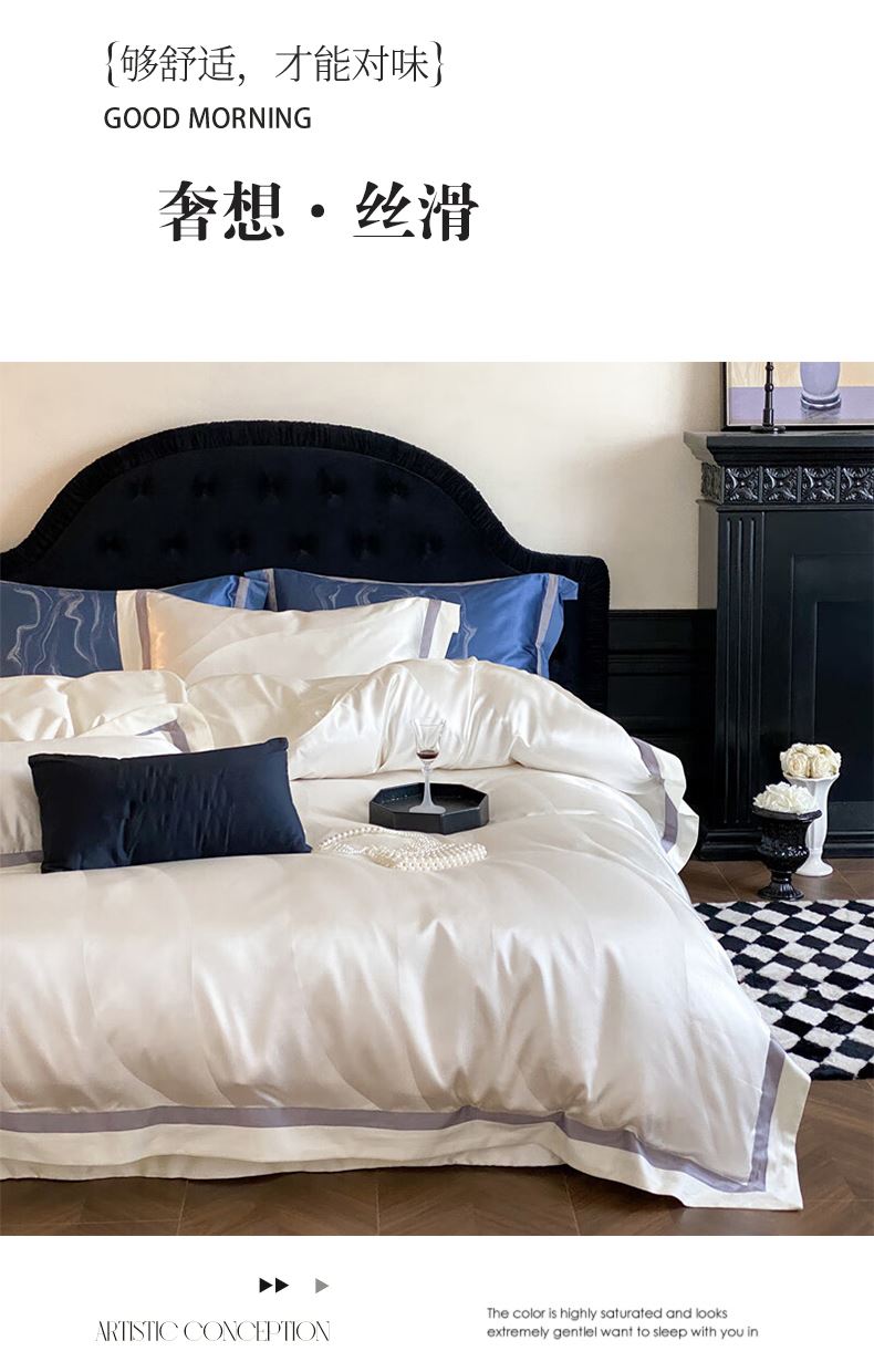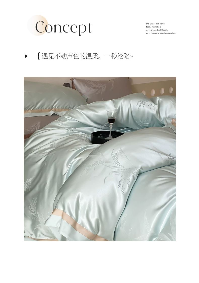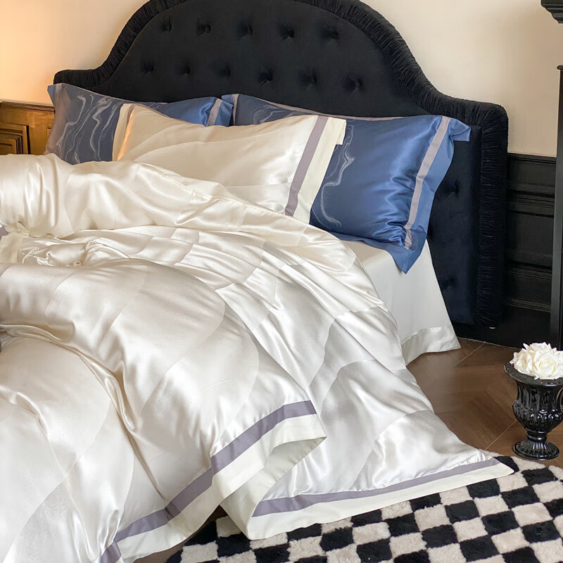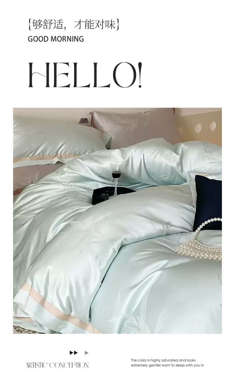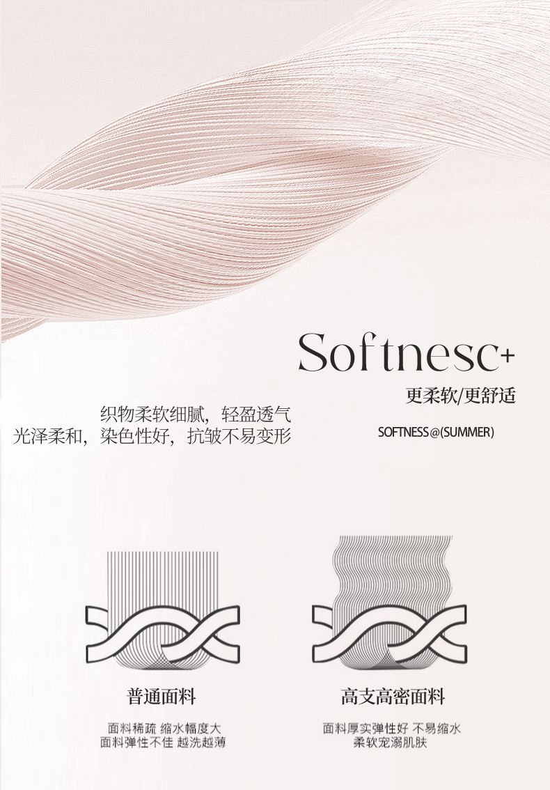 被套:200*230cm 床單:245*250cm 枕套:48*74cm*2 面料:水光肌提花緞 執(zhí)行標(biāo)準(zhǔn):GB/T22796-2021 安全類別:GB18401-2010 B類 采用創(chuàng)新水光肌提花緞面料,以媲美護(hù)膚品的細(xì)膩光澤重新定義睡眠奢華。面料通過(guò)高密緞紋工藝織就,表面呈現(xiàn)如珍珠貝母般流動(dòng)的光澤感,觸感似融化的乳霜般絲滑親膚。